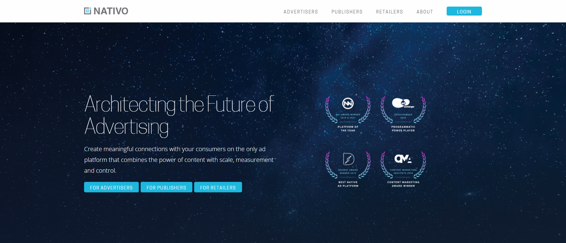 关于Nativo Nativo的功能服务 1、未来广告平台 2、使用托管或自助服务解决方案寻找需求 3、访问最广泛的广告格式和工具 使命