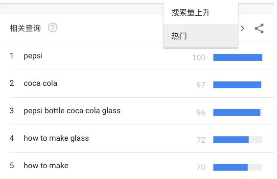 (4)相关查询--可以通过“搜索量上升”或者是“热门”进行排序: