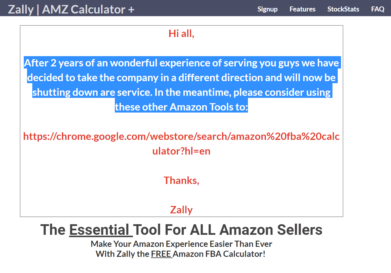 A:该工具仍在决定未来是否免费,因为它有更大的项目将整合到Zally。该工具网站在2018年6月17日更新说:“我们知道StockStats出现问题,并正在努力解决问题。”但截止2018年9月25日整理相关信息之时,该工具网站公告称关闭服务,尚不清楚未来是否会继续给卖家提供服务: