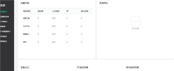 登录UEESHOP后台,首先就是数据一览,我们可以对订单金额和流量来源及热销产品,都有大致的了解。