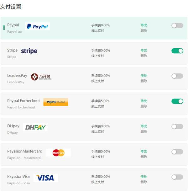 UEESHOP几乎囊括了全球所有的支付接口,包括PayPal、Stripe等等。