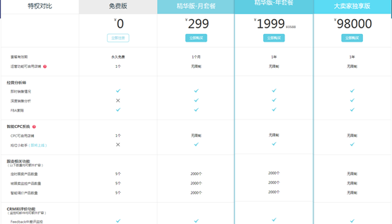 有免费版,但是功能有限制,付费版根据功能的不同而不同,精华版月费是299元每月,年付是1999元/年,大卖家独享版是9800元。