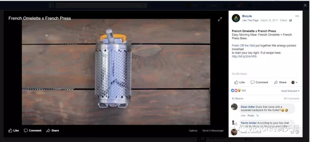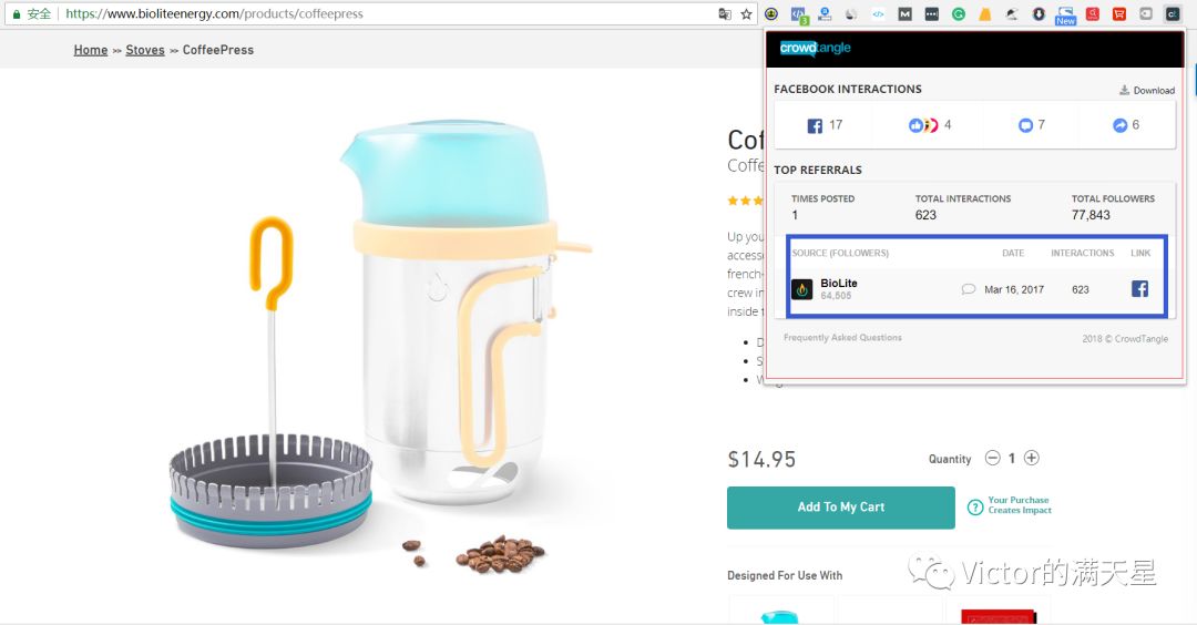 进入它的网站,选中一款它在卖的小咖啡炉,你想看看这款产品的的在社交媒体上的反响如何,点击右上角插件ct按钮,你会发现,这个页面被分享到社交媒体的情况,从上到下,按照几次分享的热度展示的(同样你也可以下载其在整个社交媒体传播的情况列表),点进去后,你会清晰发现对方关于这个产品的广告素材(文案,图片,视频,CTA等等),产品互动情况,用户在评论区的评价,如果是好的视频素材,很多跟卖的小伙伴拿来随便改改就可以用了。