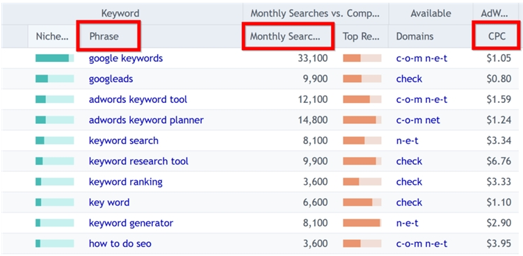 大多数结果卖家应该很熟悉,因为这些是谷歌关键词规划师中会看到的内容。事实上,“Phrase”、“Monthly Searches”和“CPC”这一栏是直接从谷歌关键词规划师中提取的,唯一不同的是,CPC在AdWords中显示为“Suggested Bid”: