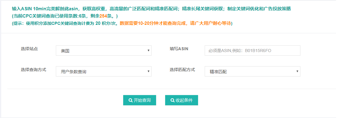 以CPC关键词投放使用为例,首先卖家要选择站点,填写asin,可以选择精准匹配或者广泛匹配(精准匹配:查出的关键词的曝光量是精准曝光量;广泛匹配:查出的关键词曝光量是广泛曝光量。)例如:输入B01BOGG5KM: