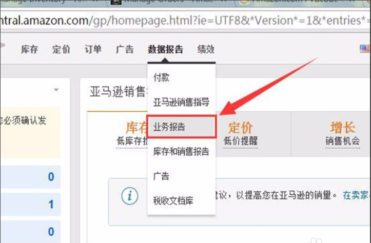 1、在后台上方的菜单上方找到“数据报告“,点开”业务报告“。