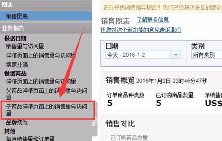2、左方菜单栏中的业务报告中我们选择”子商品详情页面上的销售量与访问量“。
