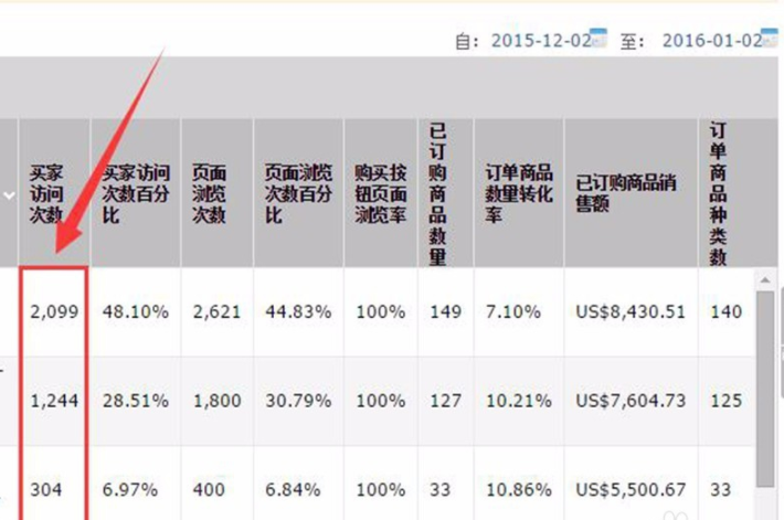 3、然后我们就可以看到一段时间内的买家访问次数了。默认一般是30天,可以通过上方调整时间范围。