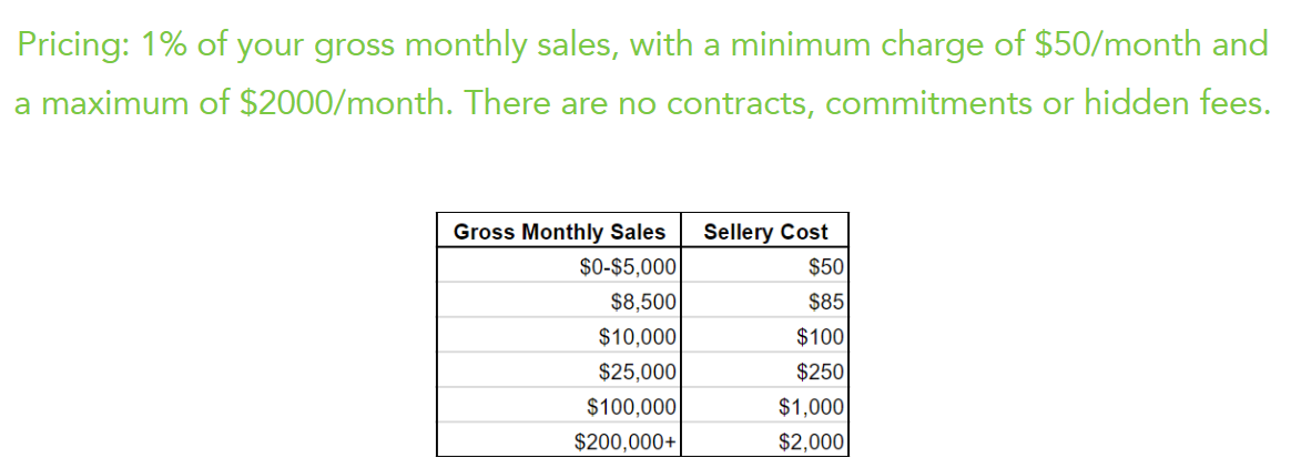 按月销售额的1%收取,最低收费标准50美元/月,最高2000美元/月。