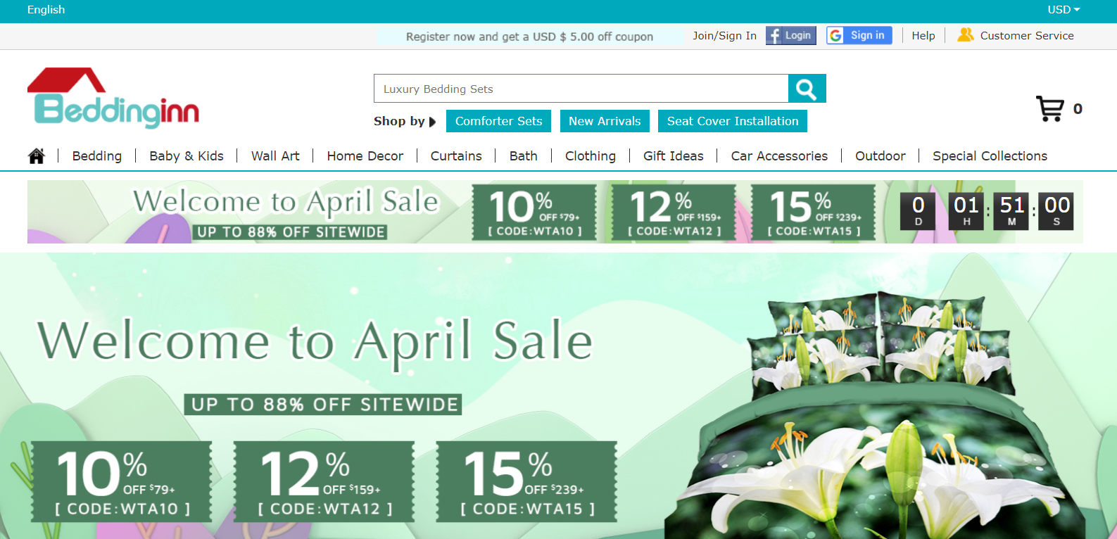 A:Beddinginn.com优惠券代码的面值将在兑换时扣除。可以在Beddinginn.com上订购。