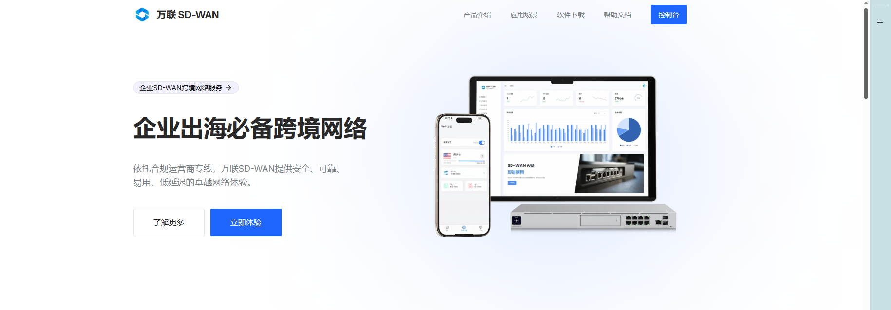 万联SD-WAN是一家专注于为企业提供高效、安全、灵活的SD-WAN专线网络服务的企业级网络解决方案提供商。其依托先进的SD-WAN技术和合规的运营商专线,致力于帮助企业构建覆盖全球的高性能网络,满足企业在跨境业务、远程办公、数据传输等方面的需求。