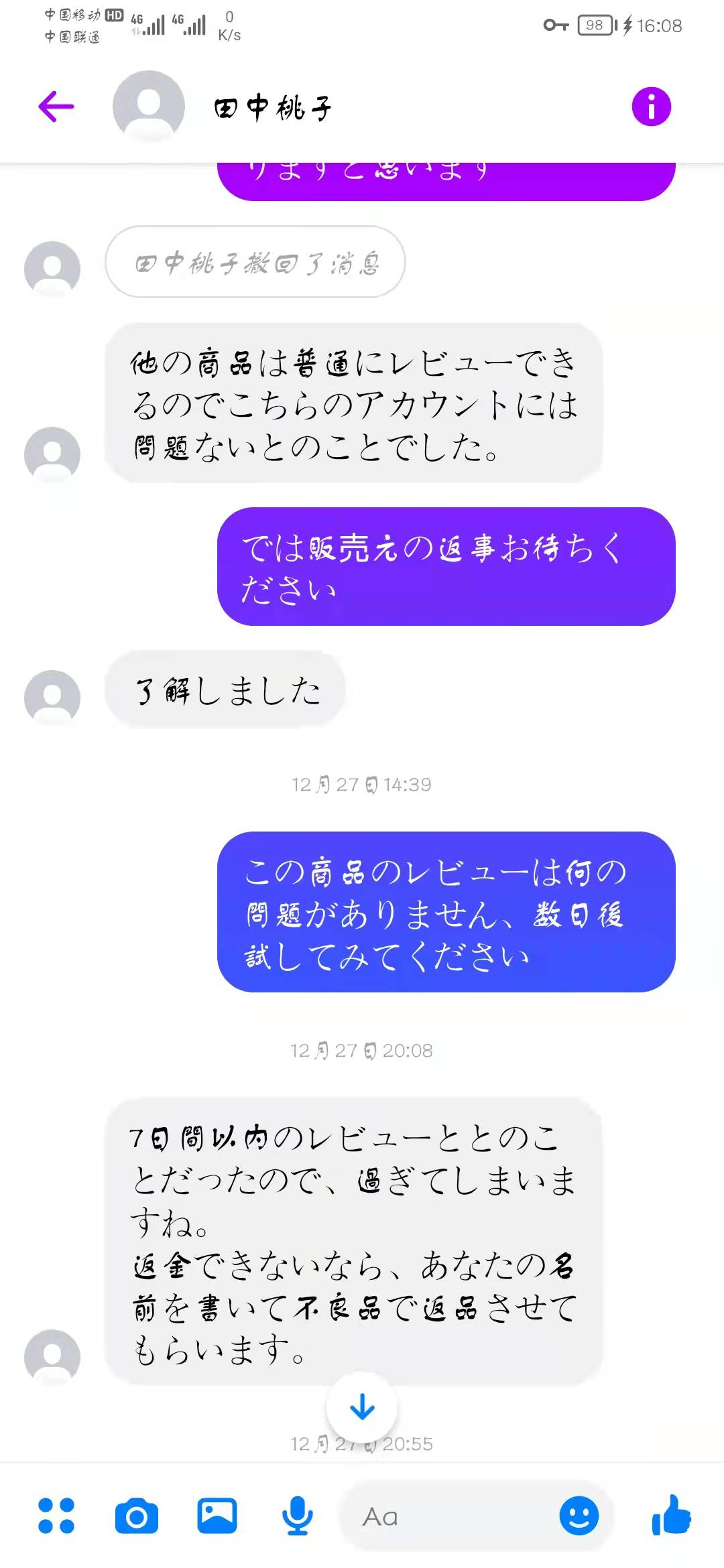 测评链接是正常可以上评的,但是她自己的号有问题提示无法上评。叫她等个几天看看,结果她立刻威胁要差评退货。啊这可真牛了,本着息事宁人吧,捏着鼻子给她退了,但是我好不爽,感觉像是吃了坨屎一样恶心。顺便贴一下她的PP,seika081226@gmail.com。大过年的大家都小心点,最近坏人太多了。