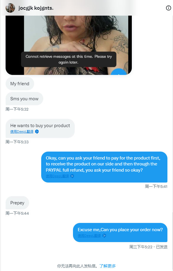 推特上面找的一个人,测评让我先PP预付款给她,付款后直接把我拉黑