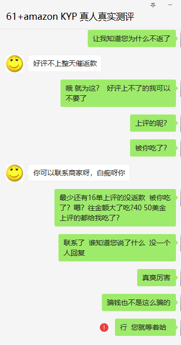 这个死全家骗子中介 每天催返款 每次都说卖家还没返款 不然就说卖家联系不上 一看到催款就干脆不回 下单 反馈评论的时候就开心的像个孤儿 还让我直接去找卖家 站内联系卖家卖家连理都不带理的 后来回复说我整天不上评整天催款 下了几十个单 有个几单产品限制上评很意外么 谁能保证说每一单都一定能上评 每天催着要返款 隔个一两天心情好了给你返两单小金额的 后面大金额的就别想要了