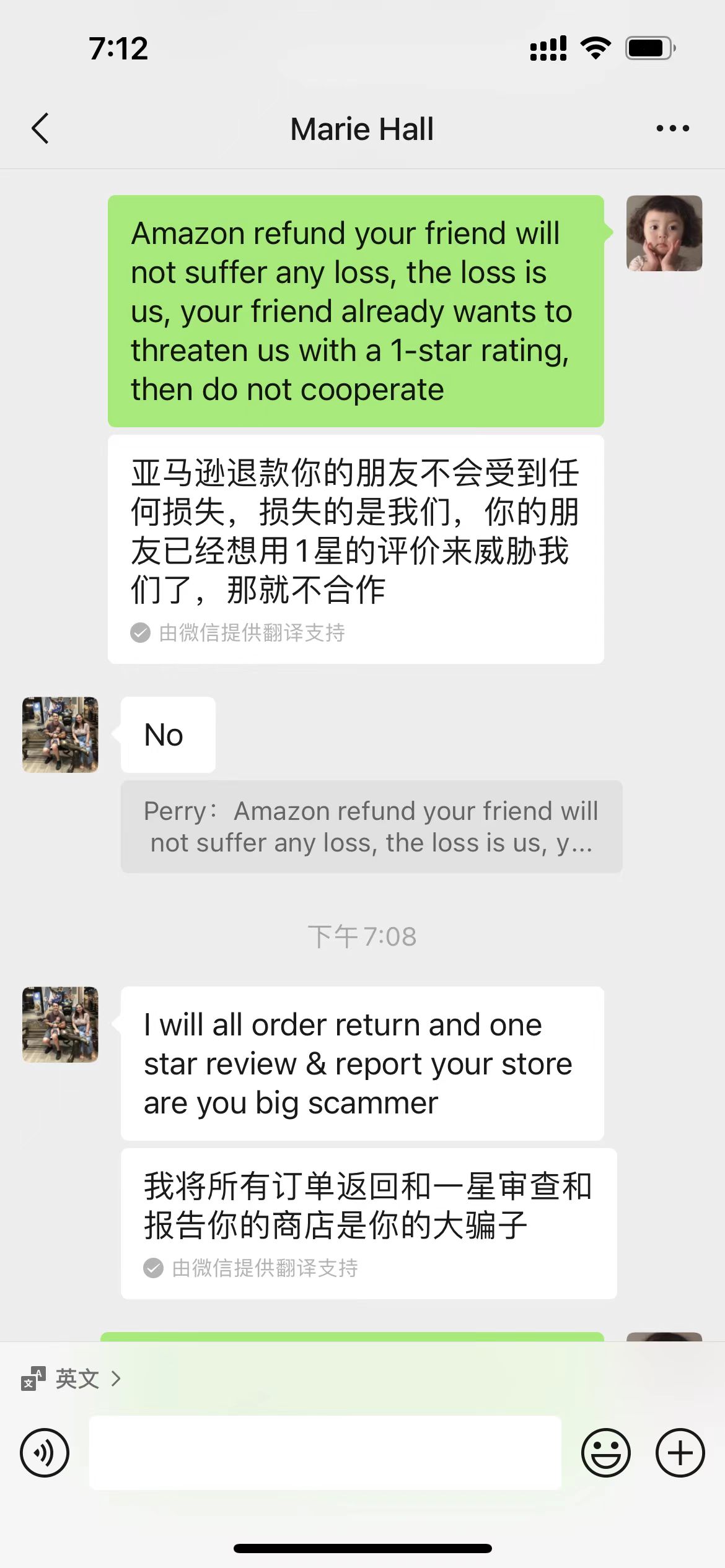 2,我要求他提供回评的截图,她没有,就是不停的催我给她退人民币的订单款,然后威胁我要全部给一星评价,再全部退货,我就是账号废了也不惯着这老外骗子,他们有一个团队,还拉我进微信群,说那里面是帮她下单的朋友,有三个女人都是美国女人的头像,我截图下来后就退群了,因为我不能再被骗了