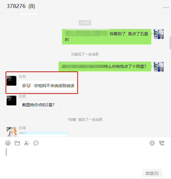 最恶心的是我刷了有点星的订单,直接来了一个二星的,我就去质疑他们是不是他们给我点的,那个陈震直接上来就爆粗。我啥都有截图,反正这些人是真的恶心,搞呗,大家抵制他们吧