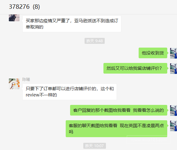还有一些订单,返款了,那个买手给我留了店铺评价然后过一会又给我申请退款,我让小绿朵测评去问是什么原因,他居然在中国时间早上11点能马上联系到人在英国的买手,那个买手还秒回他的邮件,我让他给我看邮件截图,不肯发给我看。