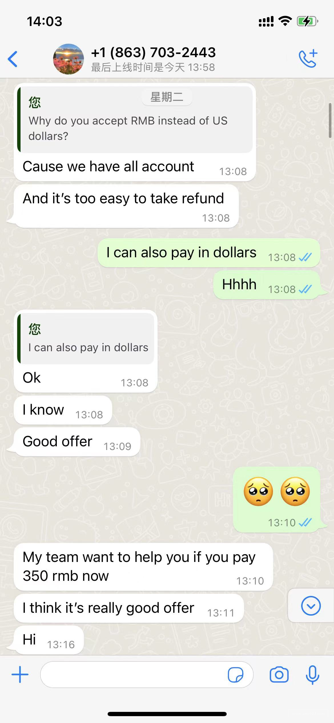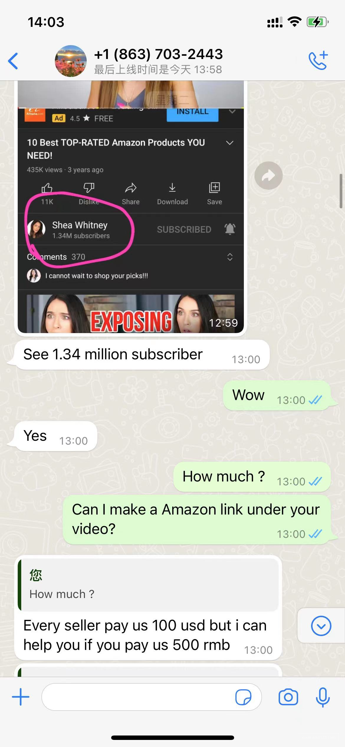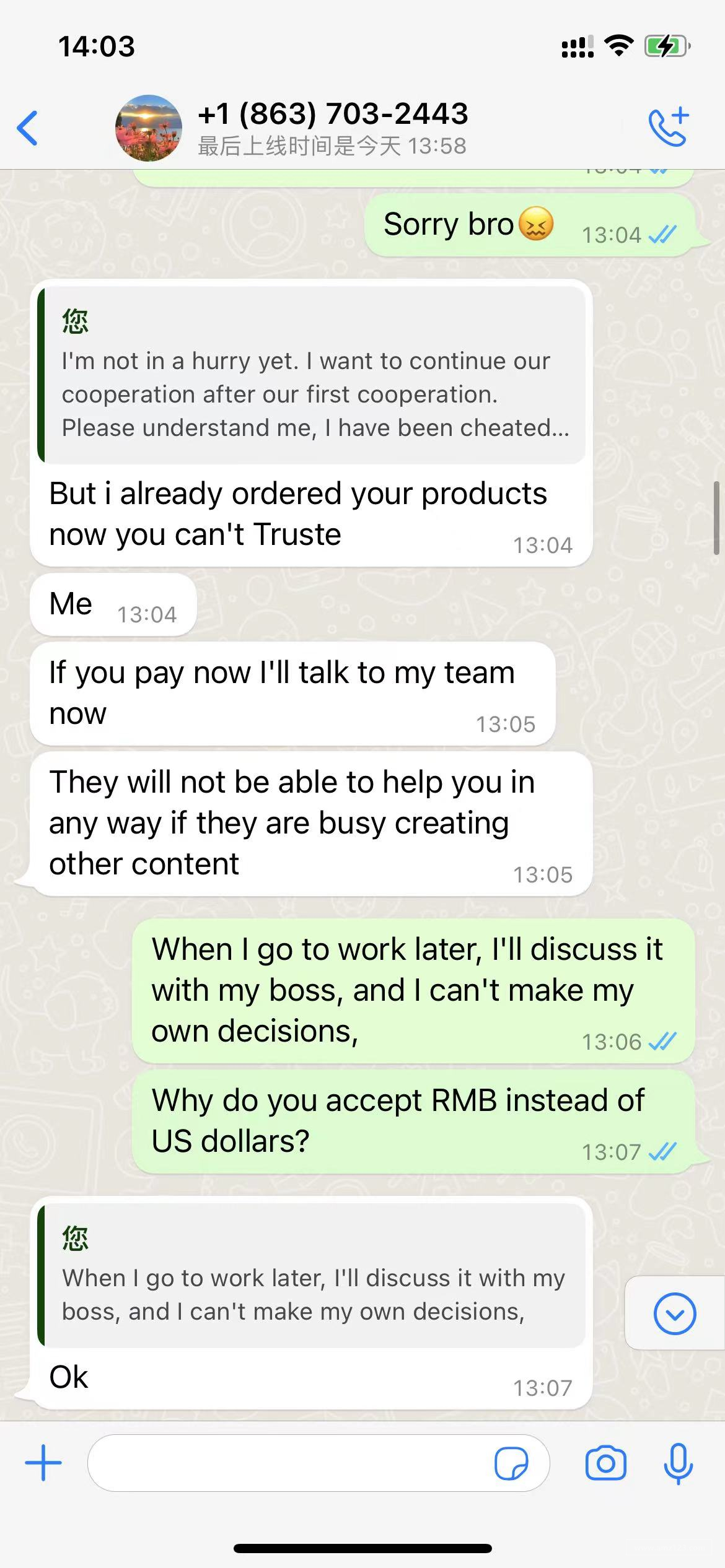 专业骗子团队,冒充TOP 买家,大家小心,他们会出先让你给钱,然后不下单,或者是你的态度很强硬的话,他们会直接下单,然后让你马上给他本金和佣金,之后就会给你留差评,你如果不给钱就不改,非常的恶新,我本来就是想下一单的,结果我发现了一个她的小号,结果!!最重要的来了!!他竟然又下了一单,,,我问他为什么没经过我的同意就下单,他说是她的丈夫,,,我无语了,,,,然后我就让他取消订单,结果他说对帐号影响不好,,,,更有意思的事,他说他是一个美国百万级别的网红一员,让我转580就可以免费给我推广,,,然后我说不用,他就一直降价降价到300,你们觉得哪个美国百万粉丝的可以300RMB给你推广?我跟他说已经有人在曝光你了,他就把我给拉黑了,,兄弟们告诉你们个方法~去找他,让他先垫付,说啥不要自己给钱哈,让他买你同行的产品,哈哈哈哈哈,你懂的,一举两得,