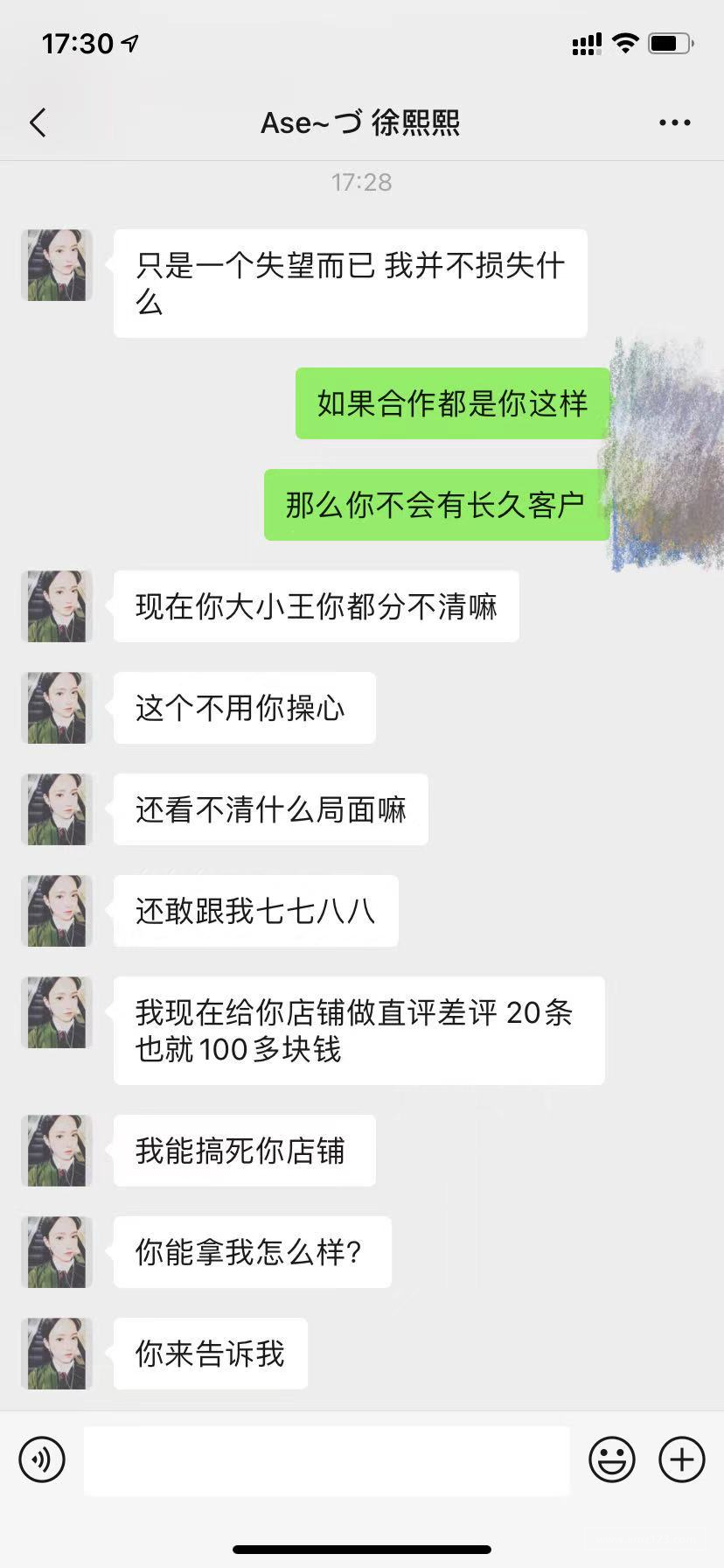 大家一定要小心一个服务商,前期还没下单的时候一直好话说,说好给图片跟视频,结果我们返款后说什么禁评了,还威胁我,一直说那些难听的话,真是恶心死了,还威胁说要搞死我们店铺,大家一定要睁大眼睛看清楚这个人
