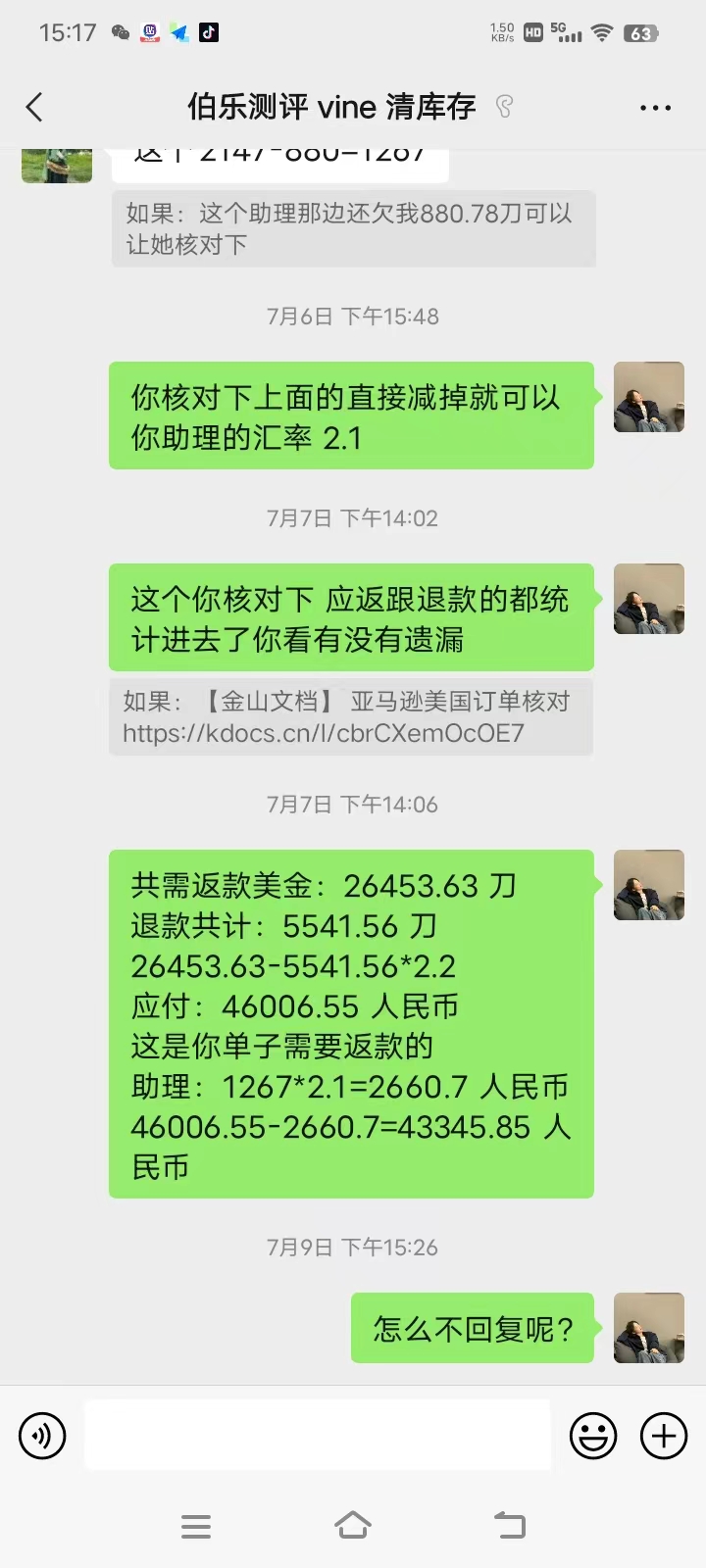 这个中介放给我的亚马逊美国单子前期合作还可以只是返款很慢我没在意因为此人谎话连篇称她上家没有给她款之后就各种借口拖延时间之后我们联系上了她对接的人钱人家4月份都已经结算给她-她可能是花完了我也懒得骂她这种货色了因为订单很多期间她只是返款少数量大部分款她自己贪了 被发现后还气急败坏满口脏话 她对接的人把聊天记录返款截图都发出来了她还不承认然后直接退群拒绝沟通我只能说穷生奸计自断财路 看见的就速度避让 在合作的就抓紧要款停止合作吧