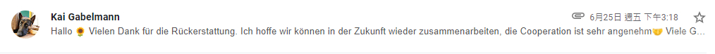 德国骗子测评,6月份帮我测评产品。当时已经全额paypal退款给他,还是货值比较高的产品。谁知道11月底给我退款,产品已经被他使用了半年。邮箱:kaigabelmann@gmx.depaypal账号:kaigabelmann@gmx.de