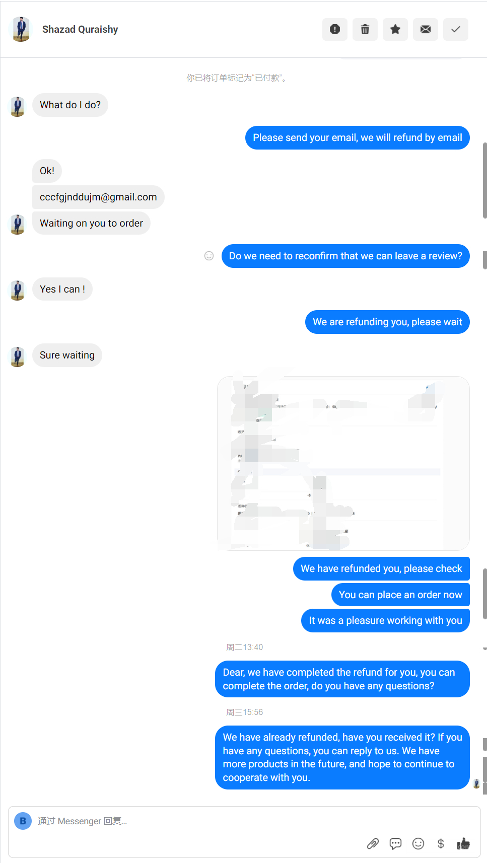 转账后不下单,信息也不回 。