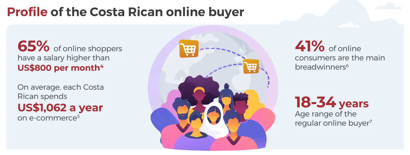 在哥斯达黎加,41%的在线消费者是家中的主要经济支柱。哥斯达黎加的大多数网购者年龄在18至34岁之间。