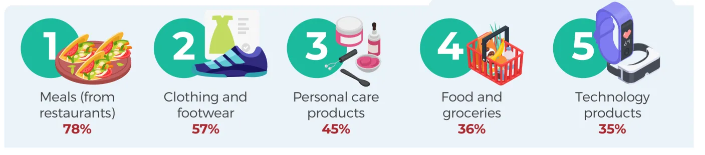 餐饮(来自餐厅)(78%)、服装和鞋类(57%)、个人护理产品(45%)、食品和杂货(36%)、科技产品(35%)。