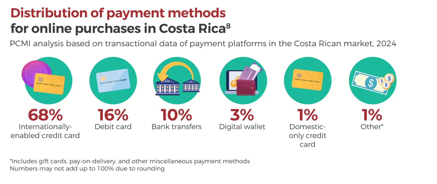 根据根据PCMI电子商务数据库,按交易量占比计算,哥斯达黎加电子商务的主要支付方式有:可使用国际功能的信用卡(68%)、借记卡(16%)、银行转账(10%)、数字钱包(3%)、仅限国内使用的信用卡(1%)、其他(1%)1%。值得注意的是,哥斯达黎加人民渴望安全多样对的支付方式期望快速可靠的配送服务。