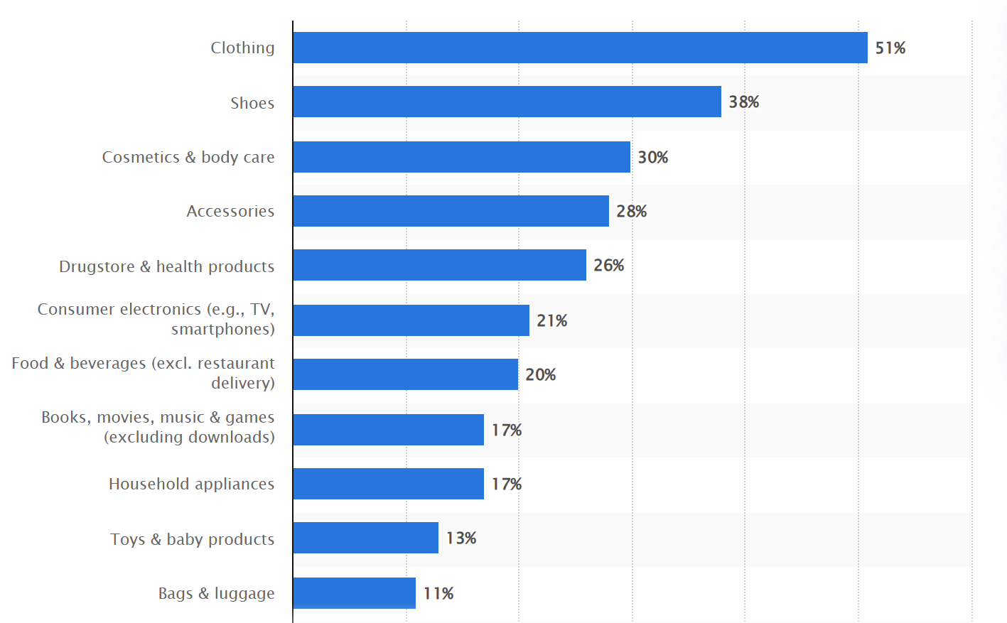 根据Statista的数据,截至2024年3月,多米尼加消费者最喜欢在线购买的两个类别是服装和鞋子。在多米尼加共和国的 1034 名受访者中,分别有 51% 和 38% 的消费者选择服装和鞋子。