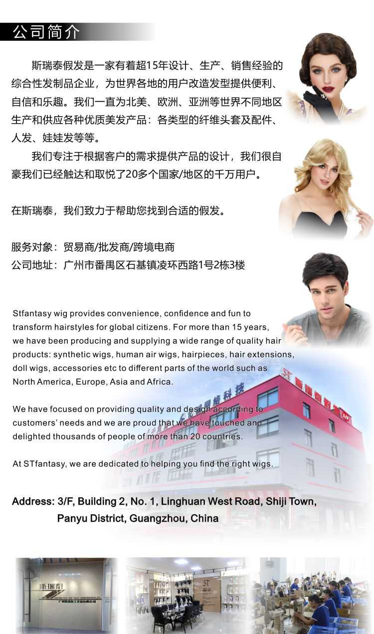 广州斯瑞泰工艺品有限公司,成立于2007年,坐落在广州番禺石基镇,是一家集研发假发、生产假发、销售假发为一体的综合性假发发制品企业,拥有2000余平米的现代化厂房,完整、科学的质量管理体系。 我们的假发产品热销欧美市场,一直为众多海外大客户长年供货,因假发产品款式创新,质量稳定而倍受客户青睐。 1.公司主营:各种中高档男女士假发头套,假发配件以及服装模特专用假发。 2.采用日本 KANE KALON,TOYOKALON以及南韩FALANG等品牌发料生产。产品通过SGS,Intertek的严格测试。 3. 拥有多名资深设计师组成的设计研发团队,技术过硬,操作能力强的专业技术人员,开发假发款式达数千种,假发现货款式多样。