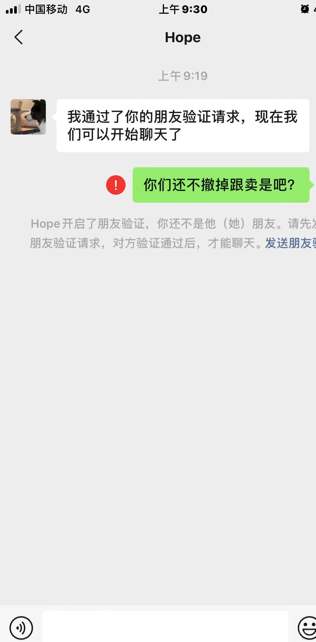发现跟卖后发邮件到后台,然后打电话过去,说是先看看,2小时候再打电话过去,问我要item id给他查,查到后跟我说是其它人搞的,说帮我跟他说一下。第二天还是没撤跟卖,打电话过去不说话,再打就不接了,加的微信也拉黑。