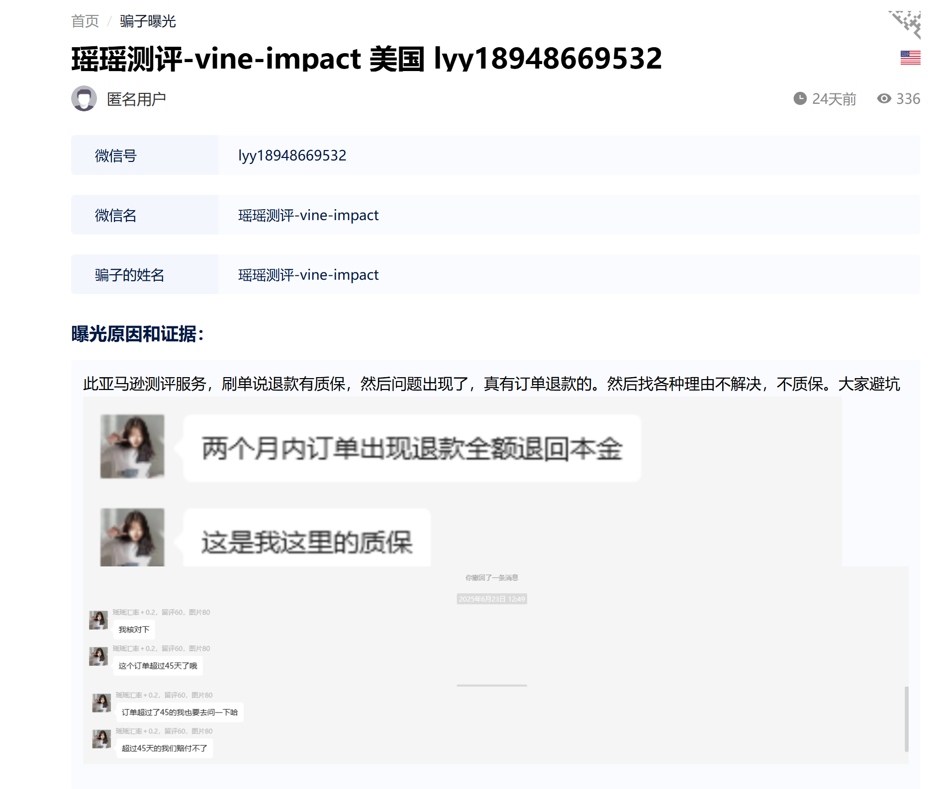 本着帮助跨境卖家曝光与避雷无良服务商/卖家的原则,AMZ123推出了查测评、骗子曝光、跟卖曝光版块。我们的查测评、骗子曝光、跟卖曝光版块,旨在为受侵害的伙伴们提供一个发声与维权的渠道,通过曝光不良行为、打击欺诈,严肃行业风气,切实捍卫大家的合法权益。