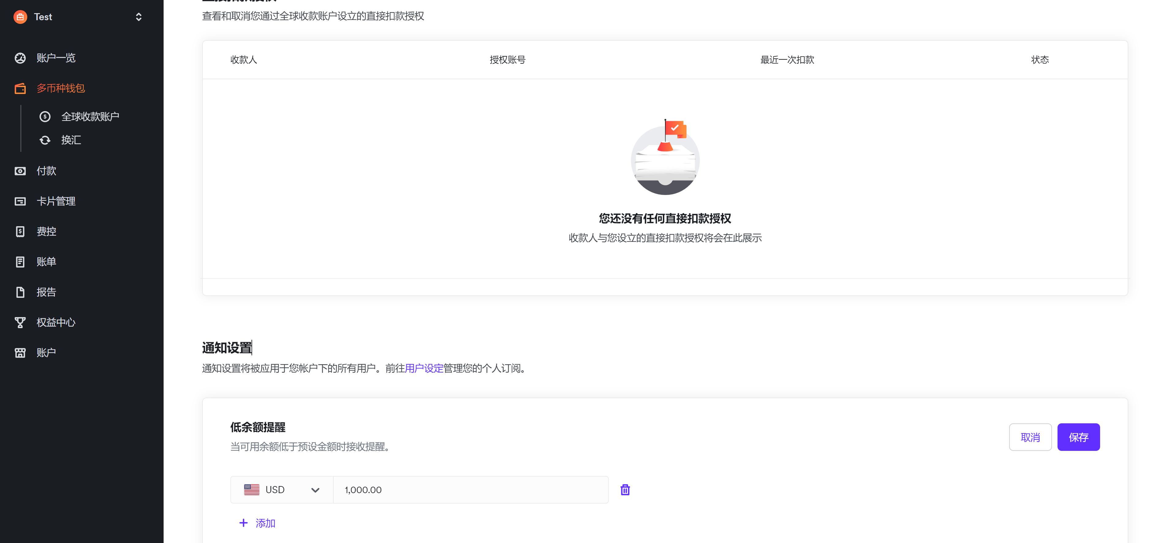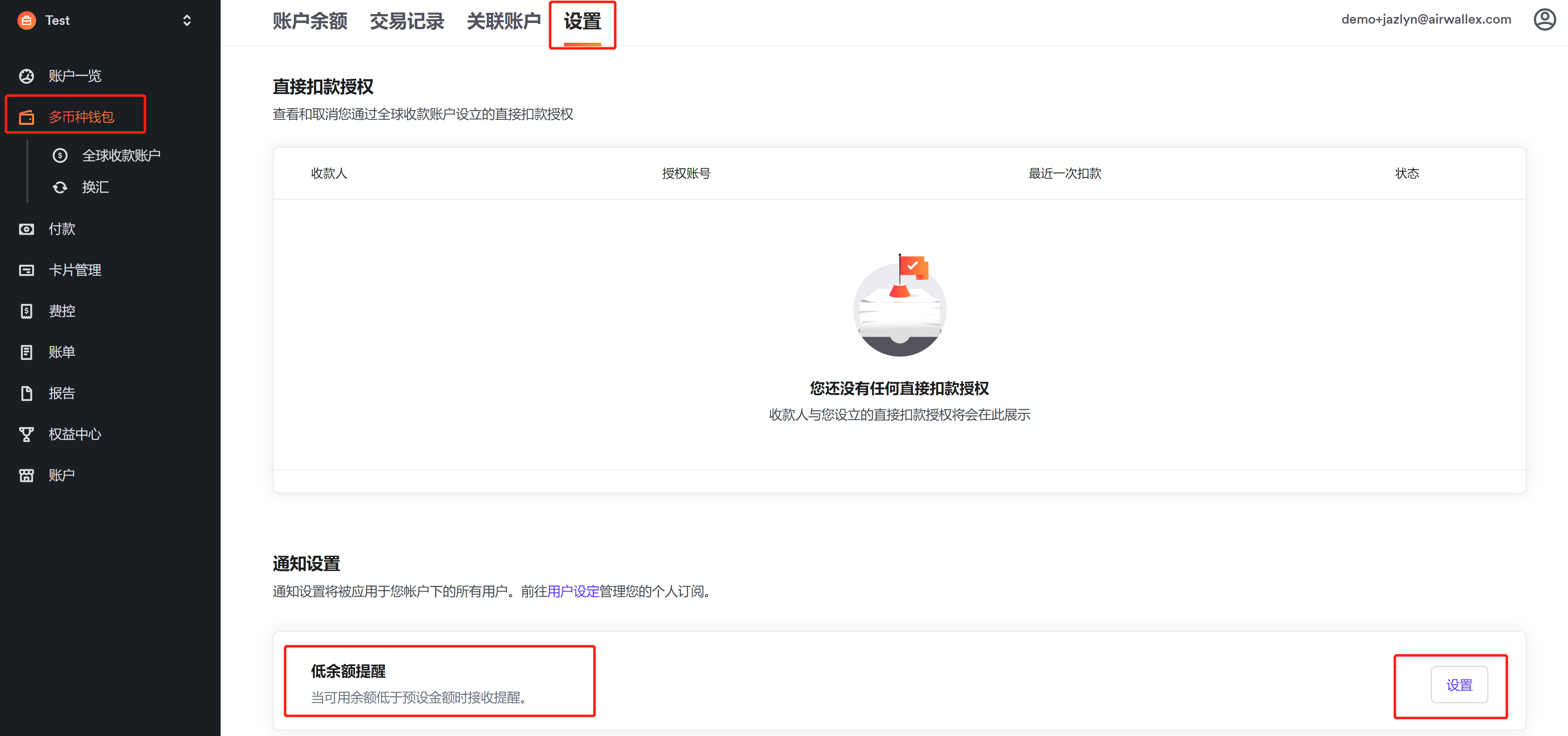 任何具有钱包查看权限的用户都可以选择接收或取消这些通知。当您的可用余额低于阈值时,我们会向所有已选择接收通知的用户发送电子邮件,请前往右上角的用户设定,选择接收或取消通知。