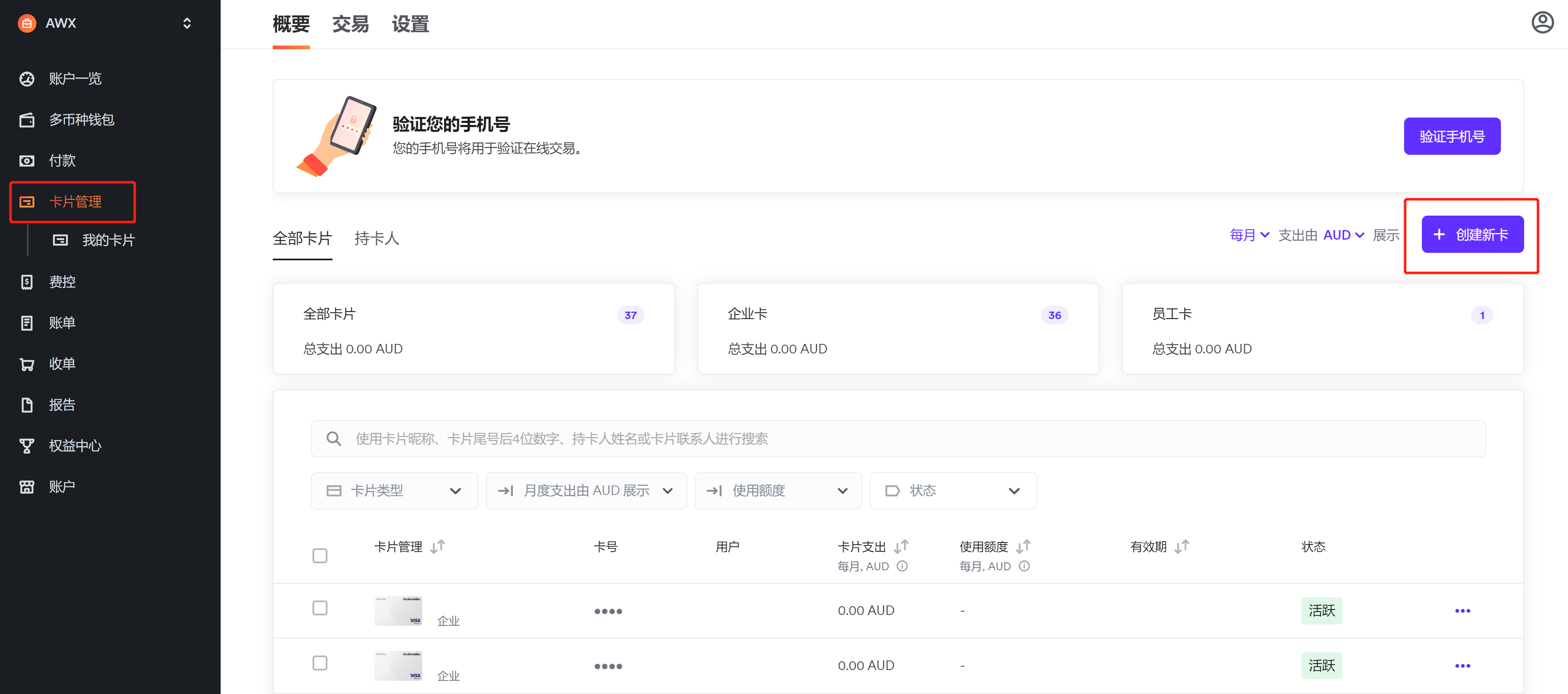 通过侧边导航栏,点击卡片管理 > 创建新卡