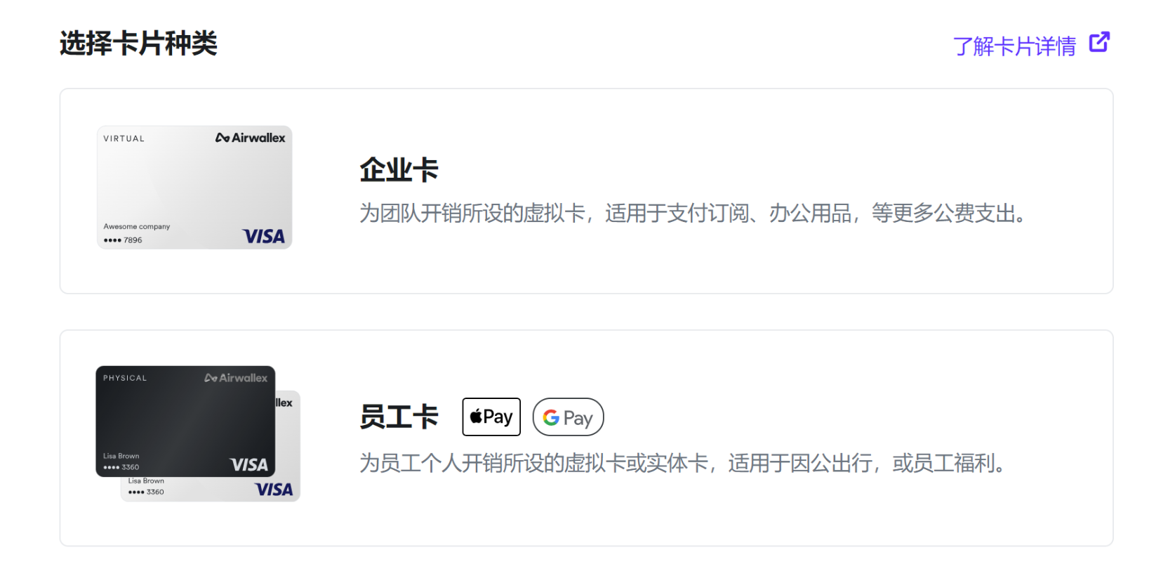 管理员用户可以按照以下步骤在账号里创建企业卡。若要更好地了解企业卡和员工卡之间的区别,请查看这里。若要创建员工卡,请点击这里查看详细指南。