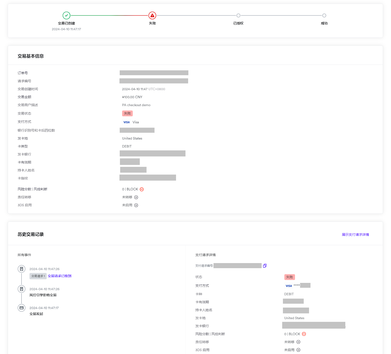请查看发卡行返回代码,以排除问题,查看商家建议代码以了解如何重试失败的交易。