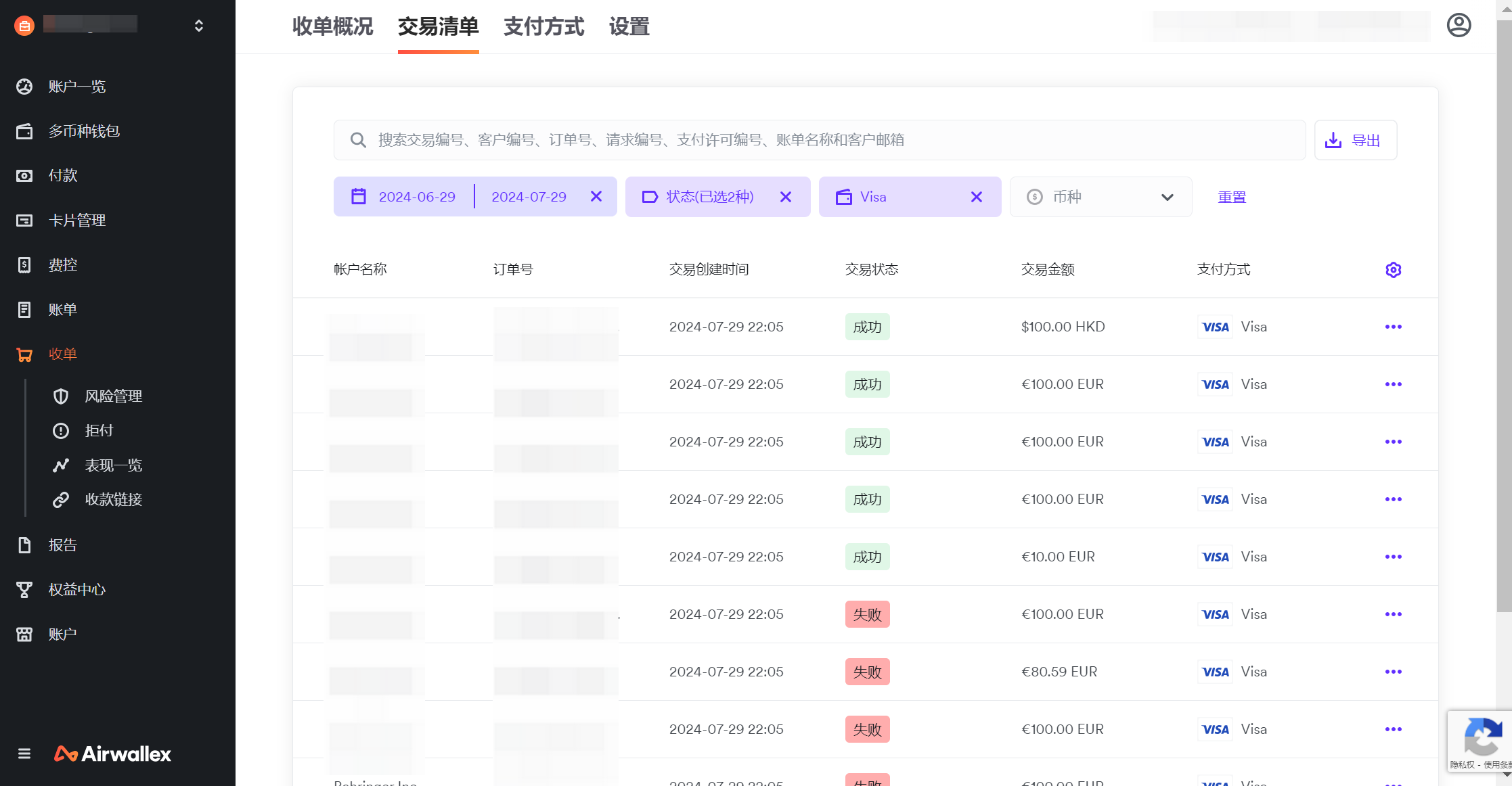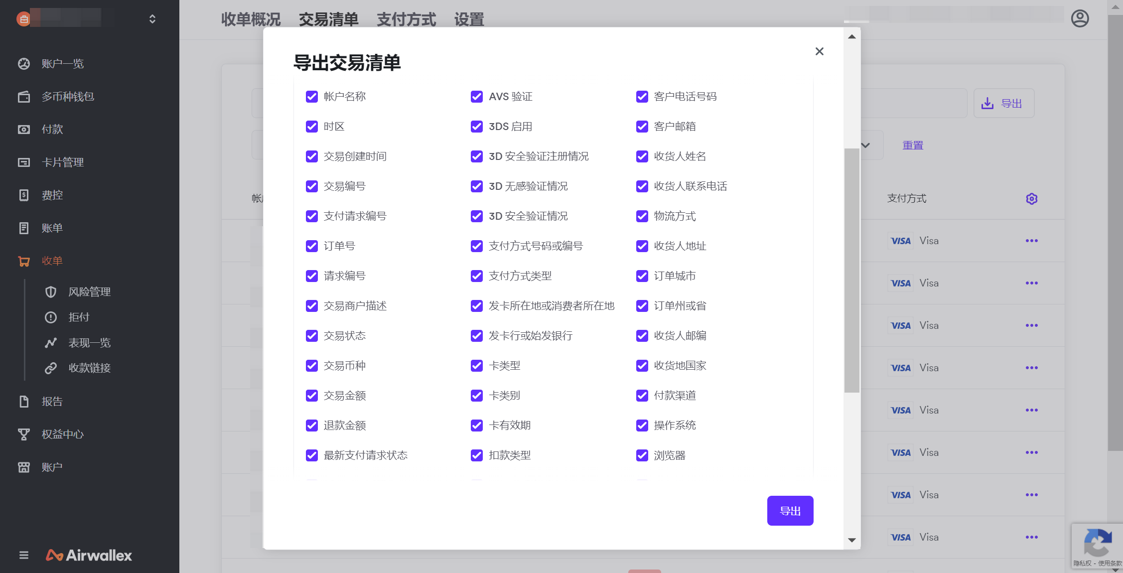 - 生成.xlsx报告:点击“收单”,点击“交易清单”,导出包括返回代码、交易描述、3DS启用、CVC码审核等详细交易信息