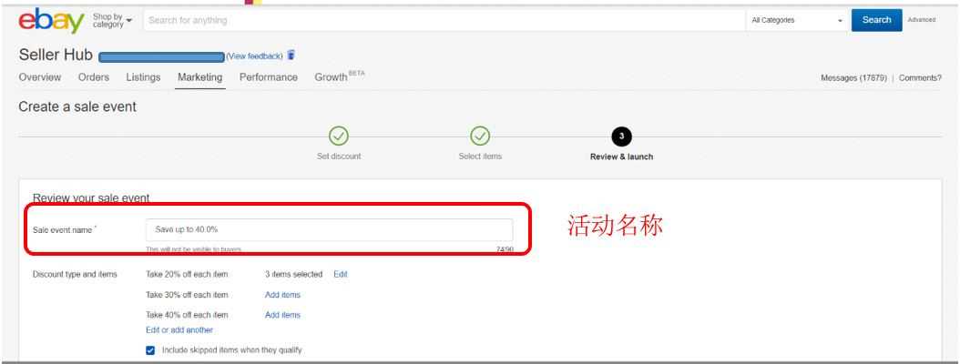 进入【Review your sale event】页面后,先给此次设置的活动命名,当然,这个命名也仅对卖家展示,买家是看不到的。然后检查活动的折扣以及对应的item数量,设置活动的有效时间,活动描述,图片及活动展示首图并预览活动Title后,这个Sale event就创建完成了。这边值得提醒大家的是,设置的sale event banner部分的内容是对买家可见的,所以请不要随便写些无关紧要的内容展示出来。