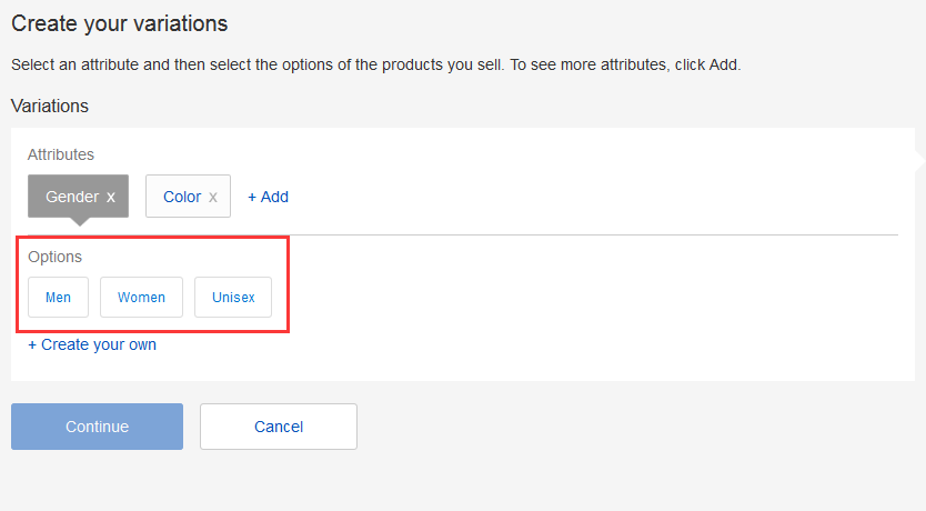 3.进入到Create variations页面后,我们可以看到eBay根据您选择的关键词和产品分类,已经默认为您推荐了一些属性类型和属性值,以本案例售卖的鞋子来看,eBay推荐了2个属性分类,分别是:性别和颜色。 而在这2个属性分类下,有推荐了一些默认的值,例如:男鞋、女鞋、中性鞋,还有米色、黑色、蓝色、棕 色等不同颜色。您可以根据自己产品的实际情况进行选择设置。