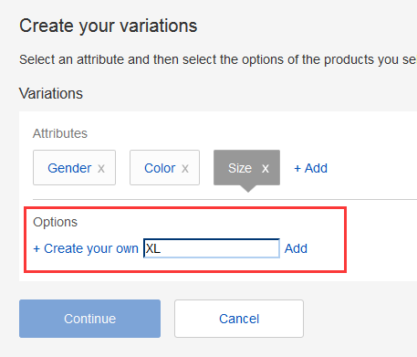 5.您可以点击【Create your own】链接,来对每个属性类型下的属性选项值进行新增。