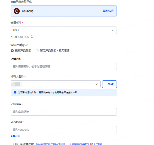 填写店铺链接信息审核,选择持有人,进行收款账号申请。