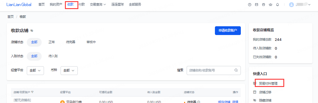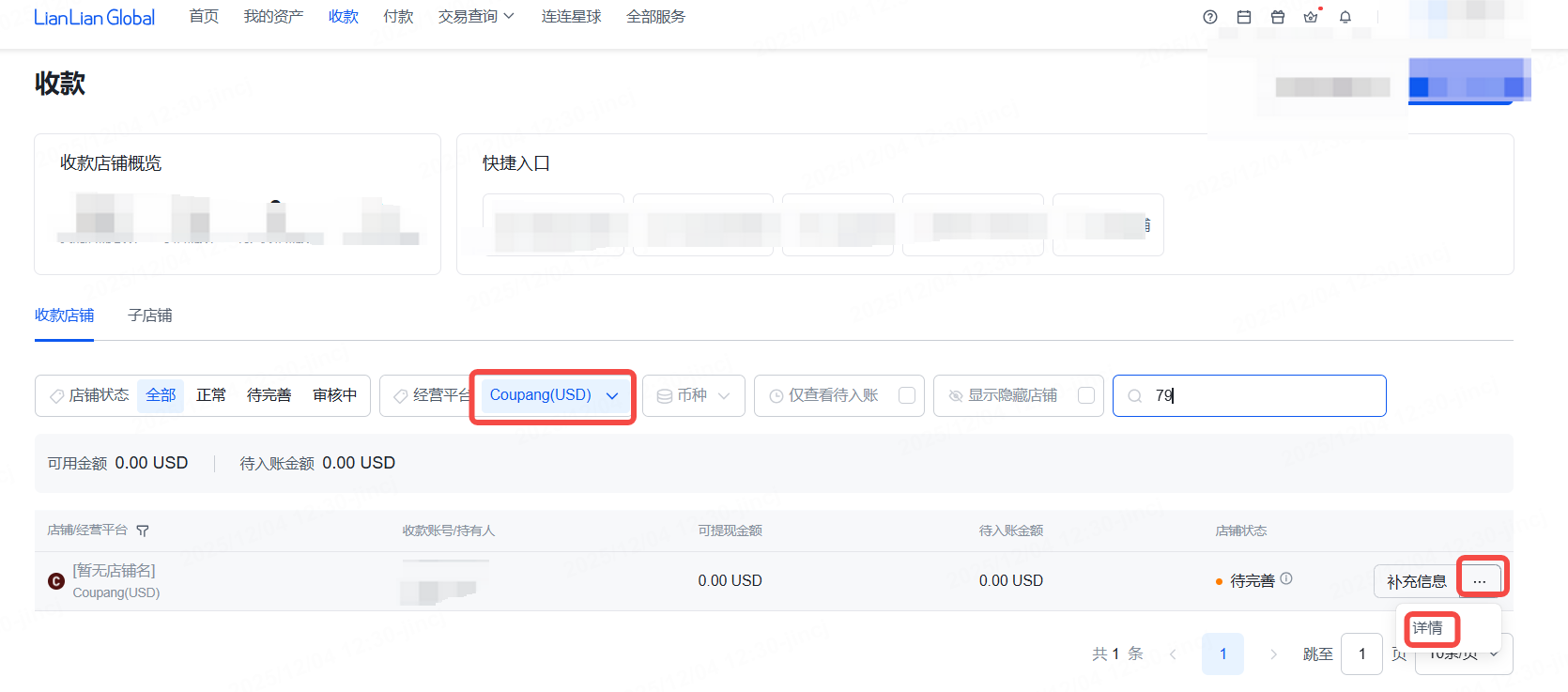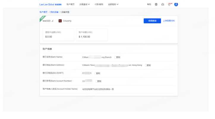 进入连连首页——【收款】,选择对应的经营平台【coupang(USD)】-详情