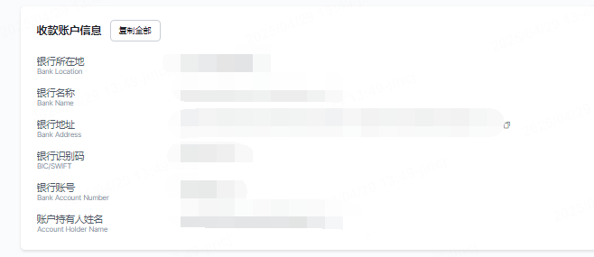 3. 如收到邮件通知添加好了新的账号 或 卖家看到 Wing 后台: “卖家信息”->”其他卖 家信息”->”海外银行账户”下方的表格里已被添加好新的账号之后,请进行下列操作。
