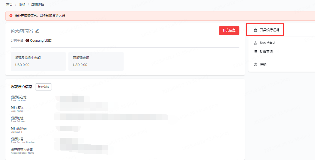 coupang店铺后台绑定连连收款账户时,需要提供银行证明。请在店铺详情页面右侧点击【开具银行证明】进行申请,审核成功后,可以在店铺详情页下载银行证明。