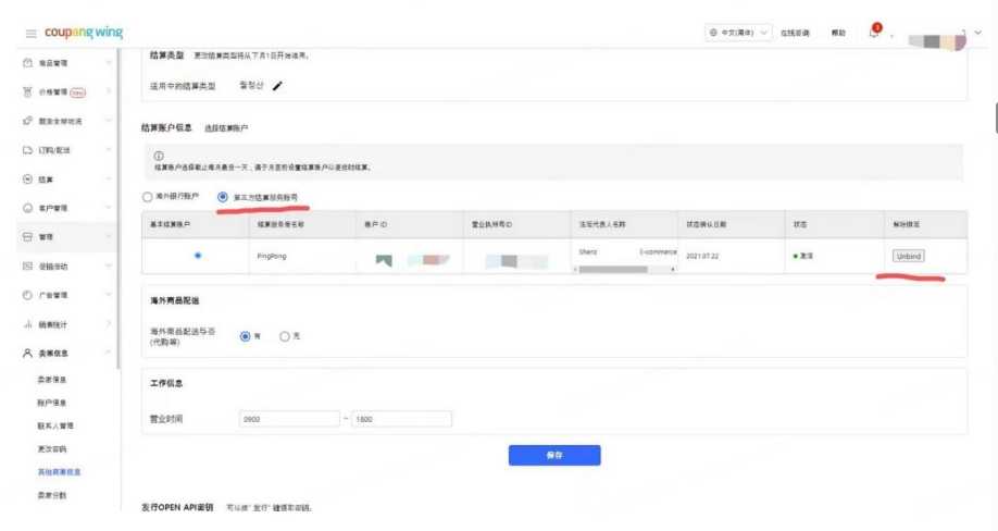 备注: - 如卖家由 Pingpong API 绑定方式(曾经老一批 Pingpong 用户使用的是 Pingpong 虚拟账号方式,须问清楚卖家是哪一种) 切换成 银行账户/Payoneer/Lianlian, 则须点击下图中”Unbind”先解绑 Pingpong 账号。