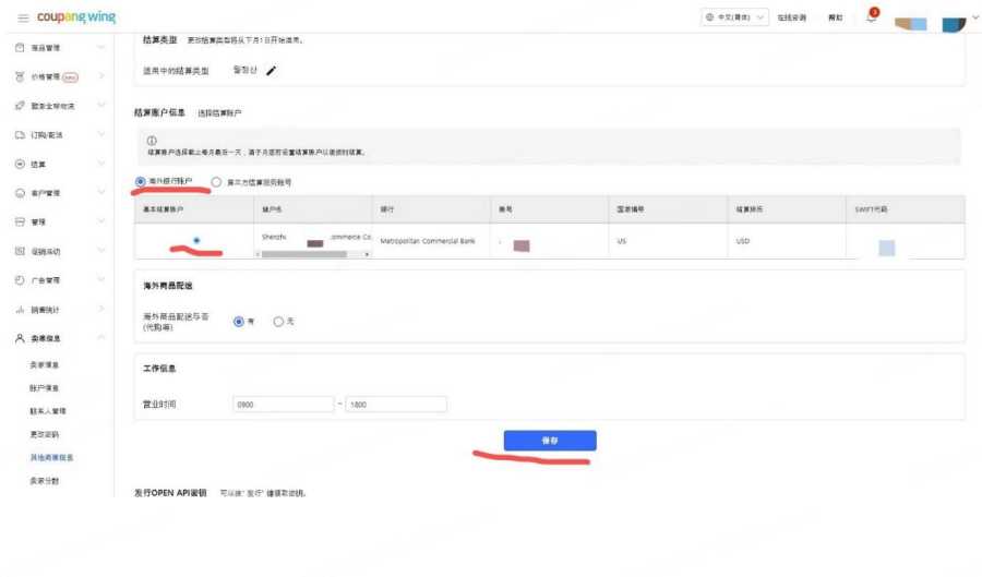Coupang 后台-填写收款账户信息,绑定连连账号信息,详见用户站-账户信息 连连的账号信息可以登陆连连后,在店铺详情中查看,