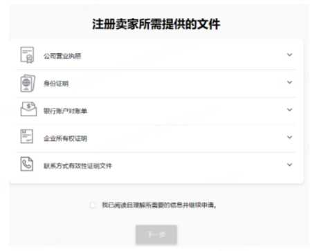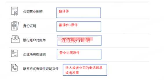 第一步:指刚入驻时填写店铺信息时: 注册前需要准备:1, 公司营业执照原件以及翻译件 2, 法人护照或者身份证原件以及翻 译件 3, lianlian 收款账号&银行证明 4, 含法人信息或者公司信息的电话账单 注意:所有输入的信息必须是英文,其中翻译件需要为翻译公司出具盖章文件或者公证过 翻译件。