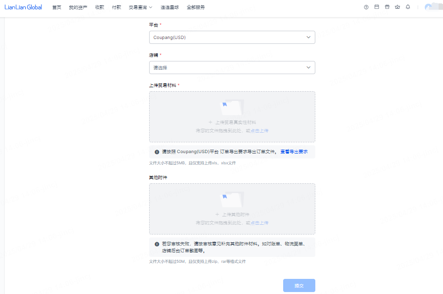 coupang资金打款到连连,入账前,需要客户在连连官网提供店铺贸易材料,计算可入账额度。