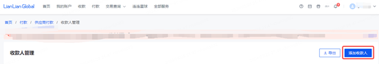 登录LianLian Global后,点击【付款】-【付款至银行账户】-【收款人管理】-【添加收款人】,输入收款人{基本信息}、{银行账户信息}后,点击【确认添加收款人】